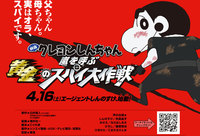 The official website for the Crayon Shin-chan anime film franchise has announced the title and release date of the next film: Eiga Crayon Shin-chan: Arashi o Yobu Ōgon no Spy Daisakusen (Crayon Shin-chan the Movie: The Golden Spy Mission). In this film which will open on April 16, 2011, the rambunctious kindergartner becomes a secret agent. Sōichi Masui (Scrapped Princess) is directing off a script by "Kogure Kyō" (Mobile Suit Gundam Seed's Kyoko Kogure).