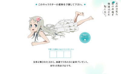 The official website of the Ano Hi Mita Hana no Namae o Boku-tachi wa Mada Shiranai. (anohana) project posted a 15-second television commercial and more details about the upcoming original television anime. (The commercial contains no actual animated footage.) Tatsuyuki Nagai (Toradora!, Toaru Kagaku no Railgun) is directing off the scripts by Mari Okada (Toradora!, Kuroshitsuji/Black Butler). Masayoshi Tanaka (Toradora!, Katekyo Hitman Reborn!) is designing the characters, and the singer-songwriter Remedios (Reimy) is composing the music. The anime will premiere next April in Fuji TV's late-night Noitamina timeslot.
