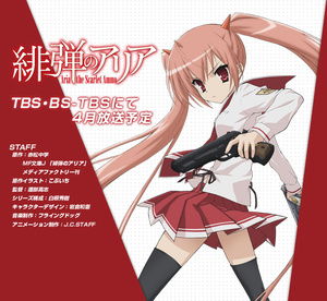 The Japanese broadcasting company TBS began streaming the second television commercial for the anime adaptation of Chūgaku Akamatsu's Aria the Scarlet Ammo (Hidan no Aria) school detective action light novel series on Friday. The video lists three more of the cast members — Mariya Ise as Riko Mine, Mikako Takahashi as Shirayuki Hotogi, and Kaori Ishihara as Reki — and contains music performed by the singer May'n, but it does not contain actual footage from the anime. The story takes place in Tokyo Butei High School, a special school where armed detectives — "Butei" — are trained to use weapons. The anime will premiere in Japan on April 7.
