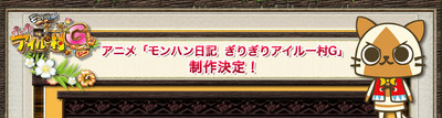 Production on a sequel to MonHun Nikki Girigiri Airū-mura Airū Kiki Ippatsu, the series of television anime shorts that promoted CAPCOM's MonHun Nikki Pokapoka Airū-mura game for the Sony PSP system, has been green-lit. The MonHun Nikki Girigiri Airū-mura G anime will tie into the MonHun Nikki Pokapoka Airū-mura G game sequel, which CAPCOM will ship for the PSP in Japan this summer.