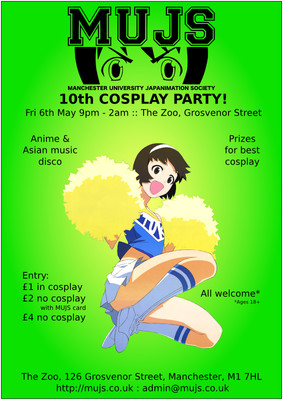 The Manchester University Japanimation Society (MUJS) will hold its tenth cosplay party on Friday May 6. Times and prices are on the poster opposite; the venue is here. This is an over-18 event, but is otherwise open to all.