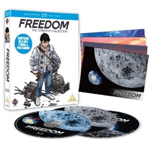 On Monday, Manga Entertainment releases Freedom, an SF adventure with character designs by Katsuhiro Ōtomo, on DVD and Blu-Ray. Originally released in Japan as a seven-part OAV series in 2006, the series follows a boy in a repressive lunar colony who's determined to find a beautiful girl who may live on the supposedly-dead Earth. The Collector's Edition pack (pictured right), which features the series on both DVD and Blu-ray, has an RRP of £34.99, while the DVD-only edition has an RRP of £24.99. (Beez briefly released the series as a U.K. Blu-Ray in 2008.)