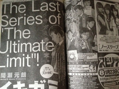 This year's seventh issue of Shogakukan's Big Comic Spirits magazine is announcing on Monday that Motoro Mase is launching the 20th and final arc of his Ikigami: The Ultimate Limit manga in the next issue on January 23. The arc is titled "Moboroshi no Kuni" (The Long-Lost Country.).