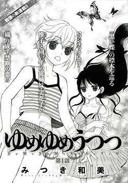 The February issue of Comic High! also launched Kazumi Mitsuki's Yume Yume Utsutsu (Dream Dream Reality) manga. The romantic horror story centers around two girls of the same age: Yuiko, who lost her older brother to suicide, and her cousin Mikako who starts living at Yuiko's home one summer. Mikako has a secret, and the two girls share a strange experience revolving around a "black butterfly" specimen.