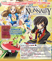 The one-episode OVA features Lelouch using his ultimate power for his little sister, Nunnally. They travel into an alternate world where the rest of the cast appears as characters from Lewis Carroll's Alice in Wonderland. The original cast is reprising their roles for the OVA. It will ship on July 27 with a 40-page picture book.