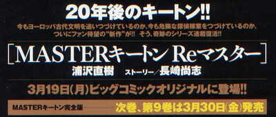 The wraparound jacket band on the 8th "complete edition" volume of Hokusei Katushika and Naoki Urasawa's Master Keaton manga revealed on Wednesday that the detective story will receive a sequel. Urasawa will return to draw Master Keaton Remaster with a story by Takashi Nagasaki (Monster, Pluto, Billy Bat). The new series will debut in Shogakukan's Big Comic Original on March 19, 18 years after the first manga concluded in the magazine.
