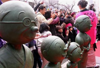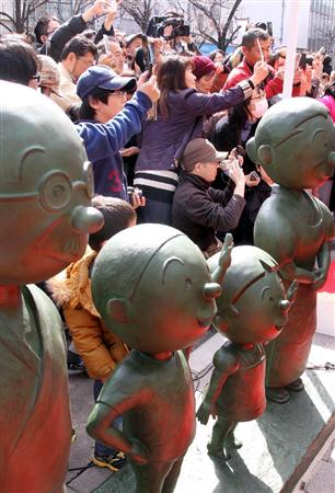 Twelve bronze statues of the characters from Machiko Hasegawa's Sazae-san manga were unveiled near Sakurashinmachi Station on the Tokyu Denentoshi Line in Tokyo on Sunday. The inhabitants of the area instigated the project to help attract more visitors to the station's local shopping areas. Hasegawa, who passed away in 1992, used to live in the area. About 200 people attended the statues' unveiling ceremony.