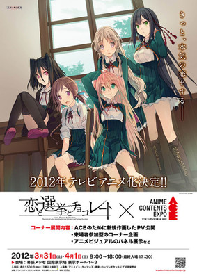 The official website for the television anime adaptation of sprite/fairys' Love, Election, & Chocolate (Koi to Senkyo to Chocolate) adult game began streaming a 90-second promotional video on Sunday. The same video ran at fairys' booth at Anime Contents Expo this past weekend.