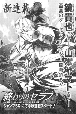 Artist Yamato Yamamoto will end his manga adaptation of Kentarō Katayama's Kure-nai light novel series in the July issue of Shueisha's Jump Square magazine on Monday. However, he is collaborating with novelist Takaya Kagami (A Dark Rabbit Has Seven Lives/Itsu-ten, The Legend of the Legendary Heroes) on a new dark fantasy manga series, tentatively titled Owari no Seraph (The Final Seraph, pictured right). The new series will debut in the same magazine this fall.