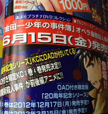 This year's 27th issue of Kodansha's Weekly Shōnen Magazine is announcing on Wednesday that the 20th-anniversary reprint of Yōzaburō Kanari and Fumiya Sato's Kindaichi Case Files (Kindaichi Shonen no Jikenbo) detective manga will bundle two original anime DVDs. The limited edition of the third and fourth volumes will include the two-part anime adaptation of the manga's Kuromajutsu Satsujin Jiken (Black Magic Murder Case) story arc. The two volumes will ship on December 17, 2012 and March 15, 2012.