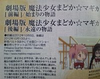 The July issue of Kadokawa Shoten's Monthly Newtype magazine is announcing on Friday that the first two films of the Puella Magi Madoka Magica trilogy will open on October 6 and October 13 at Tokyo's Shinjuku Wald 9 and other theaters nationwide. Gekijō-ban Mahō Shōjo Madoka Magica Zenpen: Hajimari no Monogatari (Puella Magi Madoka Magica the Movie Part I: The Beginning Story) will come first, followed by Gekijō-ban Mahō Shōjo Madoka Magica Kōhen: Eien no Monogatari (Puella Magi Madoka Magica the Movie Part II: The Eternal Story).