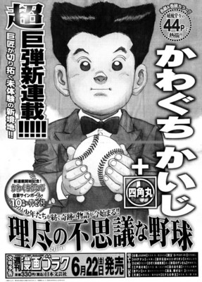 The 2,318th issue of Nihonbungeisha's Weekly Manga Goraku magazine is announcing on Friday that manga creator Kaiji Kawaguchi (Zipang, Eagle, The Silent Service) is launching a new series with Shikakumaru in the next issue on June 22. Rijin no Fushigi na Yakyū (Rijin's Mysterious Baseball) will start with a 44-page chapter (along with a color opening page and an illustration on the magazine's cover).