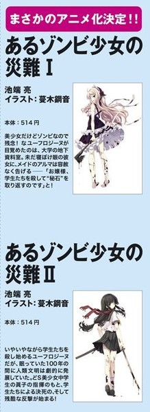 Japanese publisher Kadokawa Shoten revealed in advertising that an anime adaptation of Ryō Ikehata's Aru Zombie Shōjo no Sainan (The Misfortune of a Certain Zombie Girl) light novel series has been green-lit. The story revolves around a beautiful girl named Euphrosyne (Yūfurojiinu) who is regretfully a zombie. Yūfurojiinu wakes up in an underground archive of a university, where a maid named aruma tells her, "Madam, kill the students and retrieve the 'Secret Stone.'"