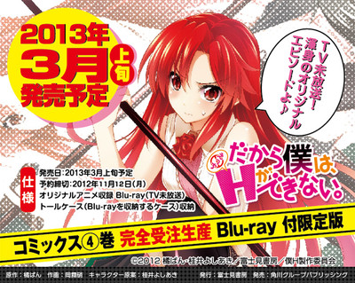Japan's Kadokawa Group Publishing announced on Friday that the fourth volume of Okagirishō's So, I Can't Play H! (Dakara Boku wa, H ga Dekinai.) manga will bundle a Blu-ray Disc with an unaired original anime episode early next March. Like the anime, the manga adapts Pan Tachibana's romantic comedy light novel series of the same name. The story follows a young man named Ryōsuke (played by Hiro Shimono) who is struggling to regain his "erotic spirit," which he lost by making a contract with a beautiful Goddess of Death named Lisara (Aya Endō).