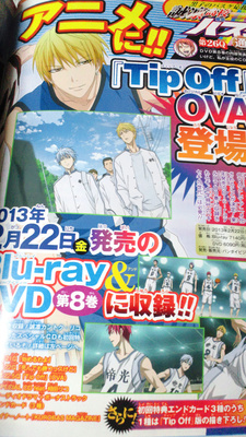 The 41st issue of Shueisha's Weekly Shonen Jump magazine is announcing on Monday that the eighth Blu-ray Disc/DVD volume of the Kuroko's Basketball (Kuroko no Basuke) anime will include a "Tip Off" original video anime (OVA). The "22.5th episode" will cover the title character Tetsuya Kuroko's past, when he was part of the vaunted "Generation of Miracles" basketball team at Teikō Middle School. Bandai Visual will release the eighth volume in Japan on February 22, 2013.