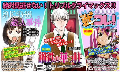 This week's issue of Shogakukan's Shonen Sunday manga magazine features the final chapters of the AKB48 Satsujin Jiken series by Gōshō Aoyama, Yasushi Akimoto, and Masaki Gotō, the Kōtetsu no Hanappashira manga by Hiroyuki Nishimori, and the Koakuma Ouden: Sencolle! manga by Noriyuki Konishi in what is being advertised as a "triple climax."