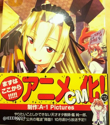 The wraparound jacket band on the third volume of Takeshi Azuma's Denpa Kyōshi - He Is [an] Ultimate Teacher manga is announcing this month that the manga is being adapted into an anime commercial by A-1 Pictures. The commercial will begin airing around October.
