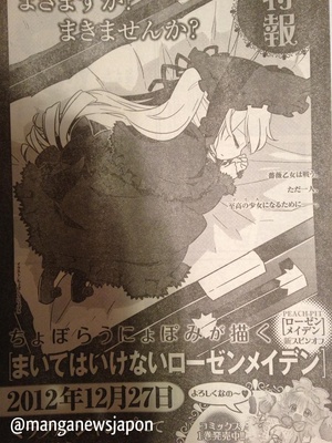 Manga creator Choboraunyopomi will debut Maite wa Ikenai Rozen Maiden, a new spinoff manga based on Peach-Pit's Rozen Maiden manga, in Shueisha's Miracle Jump magazine on December 27. Like the original manga, the spinoff manga will center around Rozen Maiden dolls who fight until there is only one left, the so-called "Alice."