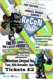 The next events in the series of RECON 2.0 comics and manga events (facebook page), held by Diamond Comic Distributors, includes one at Waterstones Liverpool One on Wednesday January 23. This event has its own facebook page, indicating that it will run from 6 p.m. to 8 p.m. and will include art and cosplay competitions, plus a quiz. Tickers are £2.