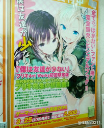 The limited first edition of the Boku wa Tomodachi ga Sukunai (Haganai) Buriki Artworks book has been delayed until March 25. The book was originally scheduled for release on February 25. Buriki is the illustrator or character designer behind Haganai, Ground Control to Psychoelectric Girl, and Nagi no Asukara.