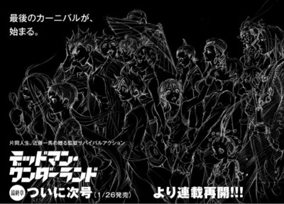 The February 2013 issue of Kadokawa Shoten's Monthly Shōnen Ace magazine announced on Wednesday that Jinsei Kataoka and Kazuma Kondou's Deadman Wonderland survival action manga will be returning from hiatus on January 26 in the magazine's March issue. The announcement also revealed that the newest chapter will begin the manga's final arc. Kondou also announced the news on his Twitter account on Wednesday and posted a preview image. The image (pictured at right) says, "the final carnival begins."