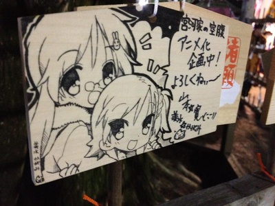 A wooden ema prayer plaque hung in offering at Washinomiya Shrine, the Tokyo area's oldest shrine and a real-life backdrop for the Lucky Star anime series, has announced that an anime adaptation of Kagami Yoshimizu's Lucky Star spinoff manga Miyakawa-ke no Kūfuku (The Miyakawa Family's Hunger) manga is in the works. The manga is based on the Lucky Star Moe Drill game series and centers around big sister Hinata Miyakawa and little sister Hikage Miyakawa's impoverished daily life at home (due to Hinata's wasteful habits) and Hikage's life at elementary school.