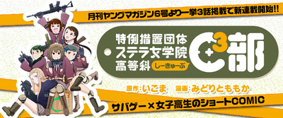 The advertising poster for the first volume of Ikoma and Tomomoka Midori's Tokurei Sochi Dantai Stella Jo-Gakuin Kōtō-ka C3-Bu (Special Measures Unit: Stella Girls' Academy High School's C3 Club) manga is announcing this week that a television anime adaptation has been green-lit. This series of manga shorts centers around high school girls ("who look super good in mini-skirts") playing survival games with airsoft and BB guns.