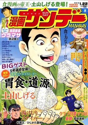 Manga Sunday has carried Shigeru Tsuchiyama's gourmet manga Gokudō Meshi, Bakuto Watanabe's Engo Buchō Uramasa, Shuichi Sakabe's Synchro, Tadashi Matsumori and Caribu Marley's Yukemuri Sniper PART Ⅲ, Masakazu Yamaguchi's Queen's Hall, Kei Honjō and Yuichiro Sueda's Sōta no Hōchō, Higashimoto's Hona, Mataashita!, Jiro Otani's Kichijōji ★Paradise, Yoneko Takamoto and Renoir Kyoudai's Wo no Koron, Tatsuki Nohda's Club Eigyō Man no Yūutsu, Naotsugu Matsueda's Shiba no Yoru, Sakura Iwamichi's Hon'nori Neko Aji, and Nao Kurebayashi and Shiro Kanō's Kanade no Sora manga series.