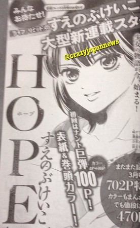 The February issue of Kodansha's Bessatsu Friend (Betsufure) magazine announced on Saturday that manga creator Keiko Suenobu (Life, The Limit) will launch her Hope series in the next issue on February 13. The manga will begin with a 100-page chapter with four color pages. Suenobu will also illustrate the March issue's cover.