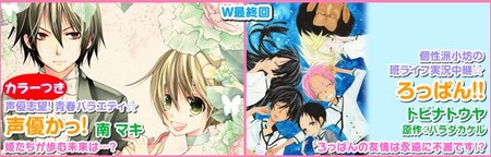 Manga creator Maki Minami is ending her Seiyū ka—! manga series (pictured at right) in this year's fifth issue of Hakusensha's Hana to Yume magazine on February 5. The same issue will also publish the final chapter of Touya Tobina (Jiu Jiu, Clean-Freak Fully-Equipped) and Kakeru Harada's Roppan!! manga (pictured far right).