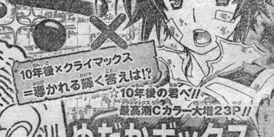 This year's 21st issue of Shueisha's Weekly Shonen Jump magazine is teasing on Monday the climax (with a question mark) of NisiOisin and Akira Akatsuki's Medaka Box manga in the following issue. Spoiler (highlight the following white text to read) The chapter will be set 10 years in the future and told by protagonist Medaka Kurokami as the 26-year old board chair of hakoniwa Academy. The chapter will be 23 pages long with a color page.