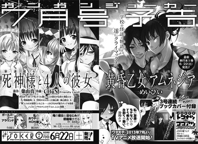 The next issue preview for Square Enix's Monthly Gangan Joker magazine announced that both Maybe's Dusk Maiden of Amnesia (Tasogare Otome×Amnesia) manga and Tomō Yokoyama's Watashi no Ouchi wa Honya-san manga will end in the July issue on June 22.