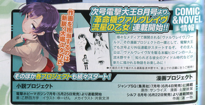 The July issue of ASCII Media Works' Monthly Comic Dengeki Daioh magazine is revealing on Sunday that a manga about the Valvrave the Liberator (Kakumeiki Valvrave) anime's Saki Rukino character will launch in the follwing issue in June. The manga titled Kakumeiki Valvrave Ryūsei no Valkyrie (Valvrave the Liberator: Shooting Star Valkyrie) will tell the story of the heroine during her time as an idol and other events, and will be penned by manga creator Yutaka Ōhori.