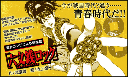 The "unprecedented Sengoku youth ballad" story will take place during Japan's Warring States Period. It will show the early years of such famous historical figures as Nobunaga, Hideyoshi, and Mitsuhide. Rokumonsen are six coins traditionally used as a burial accessory, and they became the family crest for the Sanada warrior clan of the old Shinano Province.
