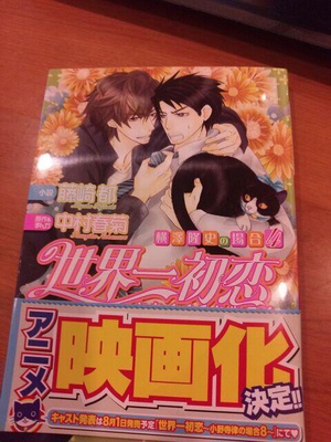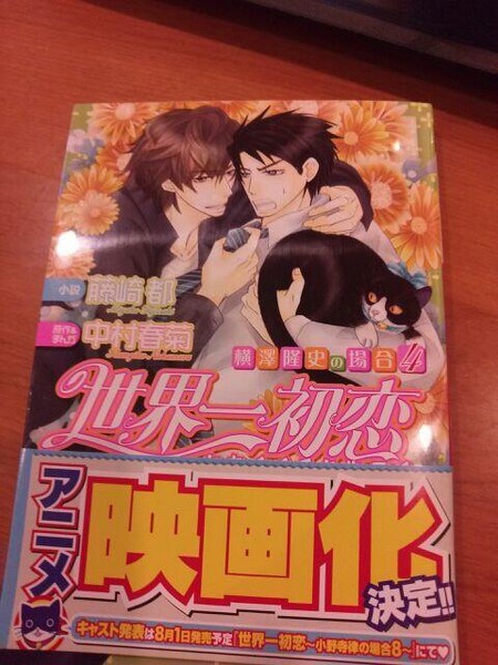 The wraparound jacket band on the fourth volume of Miyako Fujisaki and Shungiku Nakamura's Sekai-ichi Hatsukoi: Yokozawa Takafumi no Baai light novel series is announcing on Saturday that an anime film adaptation of the Sekai-ichi Hatsukoi franchise has been green-lit. The cast is scheduled to be announced on August 1 in the eighth volume of Nakamura's original Sekai-ichi Hatsukoi ~Onodera Ritsu no Baai~ manga. Kadokawa Group Publishing's Asuka Ciel magazine had announced in December that an anime adaptation of the Sekai-ichi Hatsukoi: Yokozawa Takafumi no Baai story is in the works.
