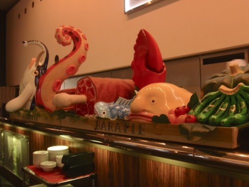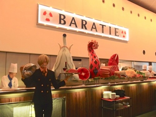 Imagined as the floating restaurant where One Piece chef character Sanji grew up in the anime series, the restaurant aims to draw customers into the anime's world. The restaurant's exterior resembles the hull of the anime's Baratie restaurant, and customers pass through the bow of Sabagashira I, the ship's mobile attack unit.