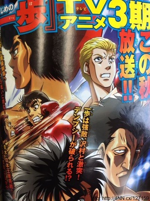 This year's 34th issue Kodansha's Weekly Shōnen Magazine is revealing on Wednesday that a third season of the television anime adaptation of George Morikawa's Hajime no Ippo (Fighting Spirit) manga has been green-lit. The anime is scheduled to begin airing this fall in Japan. The announcement image reads, “Ippo fights the formidable enemy, Sawamura! Dempsey breaks down!?”