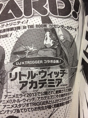 The August issue of Shueisha's Ultra Jump magazine announced on Friday that Trigger's Little Witch Academia original anime is inspiring a short manga. The manga will run in the next issue on August 19. The manga will be drawn by Terio Teri whose previous works include Hlocclinie in Kadokawa Shoten's Young Ace in 2010-2011 and adult manga published by Core Magazine.