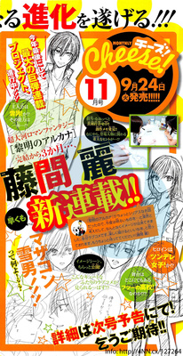 The September issue of Shogakukan's Monthly Cheese! magazine will announce on Wednesday that manga creator Rei Tōma will launch a new manga series in the November issue on September 24. The announcement (pictured at right) includes character sketches for the upcoming series.