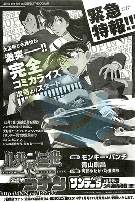 The September issue of Shogakukan's Shōnen Sunday S magazine is announcing on Thursday that a manga adaptation of the Lupin III vs. Detective Conan crossover TV anime special between and will serialize in the magazine beginning in the October issue. The adaptation will completely retell the story of the TV special, and last for 3 chapters. The Meitantei Conan: Shikkoku no Chaser manga by Yutaka Abe and Denjirō Maru will not appear during the special manga's serialization, and will restart in the magazine's first issue of 2014, which is scheduled to be released in November.