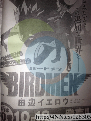 This year's 36/37th issue of Shogakukan's Shonen Sunday magazine is announcing on Wednesday that Kekkaishi manga creator Yellow Tanabe's Birdmen manga will go on hiatus until the magazine's 46th issue, which is scheduled to be released on October 16. The magazine also announced that Shogakukan will be releasing the first compiled volume of the manga around October 18. Watanabe began the manga in Shonen Sunday last month.