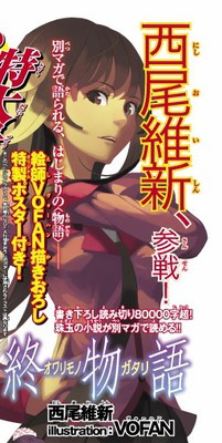 The official Twitter account for the NisiOisin Anime Project announced on Sunday that the Kodansha Box imprint will publish Owarimonogatari, NisiOisin's latest Monogatari book, this fall. In addition, the October issue of Kodansha's Bessatsu Shōnen Magazine will publish the first story from the book, "Ōgi Formula," on September 9. The story will follow what happens after the protagonist Koyomi Araragi meets a mysterious girl named Ōgi Oshino.