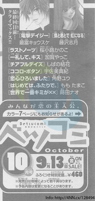 The September issue of Betsucomi also revealed that Shizuki Fujisawa's Boku to Kimi to de Niji ni Naru manga will also end in the magazine's November issue.