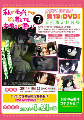 Japanese retailer Mangaoh lists the seventh volume of Nico Tanigawa's Watashi ga Motenai no wa Dou Kangaete mo Omaera ga Warui! (No Matter How I Look at It, It's You Guys' Fault I'm Not Popular! or WATAMOTE) manga in a special limited first edition bundle with an original anime DVD on October 22, 2014. The DVD will contain the unaired episode 13, which will be produced by the ongoing television anime's staff.