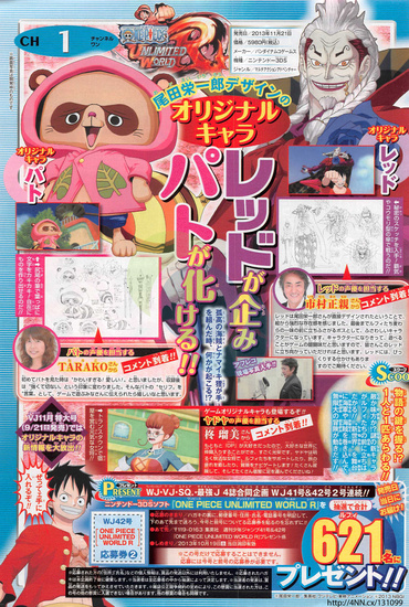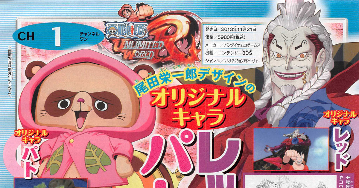 This year's 42nd issue of Shueisha's Weekly Shonen Jump magazine is announcing on Monday that the upcoming Nintendo 3DS game One Piece Unlimited World Red is getting two original characters. One of the characters was previewed in a promotional video last month. The game will feature the new character Red (pictured top right in image), who will be voiced by Masachika Ichimura (Pokémon: The First Movie's Mewtwo, Final Fantasy VII: Advent Children's Red XIII). Additionally, the game will feature the original raccoon character Pat (pictured at left in image), voiced by TARAKO (Chibi Maruko-chan's titular character, Noir's Altena). The two mysterious new characters who may be friend or foe will hold the key to the game's story, which is set in the New World. One Piece manga creator Eiichiro Oda designed both of the new characters.