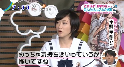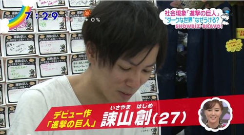 On the program, 27-year old Isayama said that he looks at a reference book for various human expressions when drawing the giant Titans for the manga, which is the first series that he has ever published.