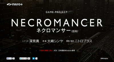 Game maker Nitroplus announced at its "Nitro Super Sonic 2013" event on Saturday that it is producing its next work, the tentatively titled adult Windows adventure game Necromancer. Makoto Fukami, Gen Urobuchi's collaborator on almost all of the Psycho-Pass anime episode scripts, is writing the game's scenario, and Shinya Ōsaki (Gekkō no Carnevale, Hanachirasu) is contributing the art.