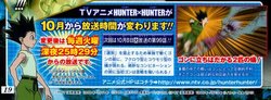 This year's 44th issue of Shueisha's Weekly Shonen Jump magazine is announcing on Monday that the ongoing Hunter x Hunter anime series will switch broadcast timeslots from Sunday mornings to late Tuesday nights. The change will start on Tuesday, October 8 at 25:29 (effectively Wednesday, October 9 at 1:29 a.m.)