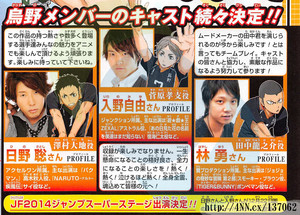 This year's 51st issue of Shueisha's Weekly Shonen Jump Magazine is announcing on Monday three more cast members for the anime adaptation of Haruichi Furudate's Haikyu!! volleyball manga on Monday. Satoshi Hino (The Familiar of Zero, Shakugan no Shana) will play Daichi Sawamura, Miyu Irino (Sacred Seven, Kingdom Hearts) will play Kōshi Sugawara, and Yuu Hayashi (JoJo's Bizarre Adventure, Kingdom Hearts II) will play Ryūnosuke Tanaka.