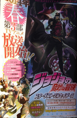 The December issue of Shueisha's Ultra Jump magazine is announcing on Tuesday that JoJo's Bizarre Adventure: Stardust Crusaders, the television anime adaptation of Part 3 of Hirohiko Araki's original manga, will premiere in spring 2014.